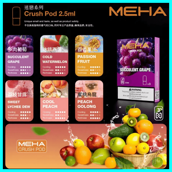 MEHA魅嗨全新第五代霧化煙彈重磅登場,單顆容量達2.5mL,尼古丁濃度3%,結合全新加熱技術與防漏結構,帶來更加細膩且飽滿的煙霧體驗。全系列涵蓋16款風味,橫跨水果、茶飲、清爽與醇厚類別,搭配三段可調電子煙桿功率